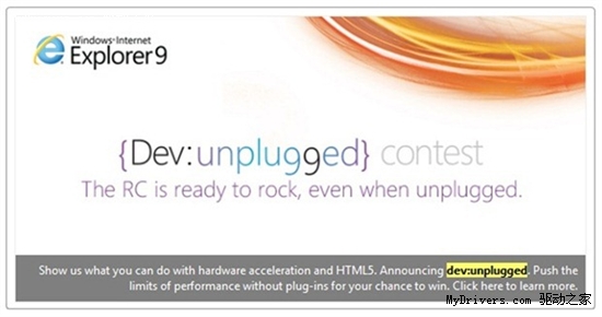 從圖中的信息可以知道,這是微軟即將舉辦的一次競賽活動,鼓勵開發人員為IE9 RC開發一些不需要插件(plugin)就可以實現的功能。這里并沒有提及該競賽的獎勵或是開始、截止日期。不過相信微軟會很快宣布這個活動,畢竟這是為IE9 RC準備的,而不是正式版。