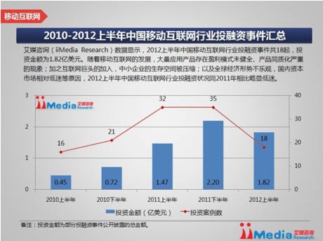來自艾媒的數據顯示,2012年上半年獲得融資的案例是18起,數量較2011年下半年的35起比例下降49%,較去年同期的32起下降44%。