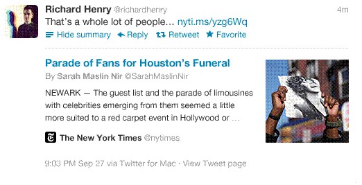 Twitter Cards實際上是一種為拓展后的、富媒體的Twitter消息提供支持的技術(shù)。在加入一些代碼行以后,出版商、品牌和開發(fā)者就能創(chuàng)造出更好的Twitter消息,在Twitter數(shù)據(jù)流內(nèi)部展示其內(nèi)容。舉例來說,當(dāng)AllThingsD和《紐約時報》等網(wǎng)站通過Twitter消息來發(fā)布指向一篇報道的鏈接時,一張“摘要卡”就能顯示出一個更加精心設(shè)計的版本,就像是這樣: