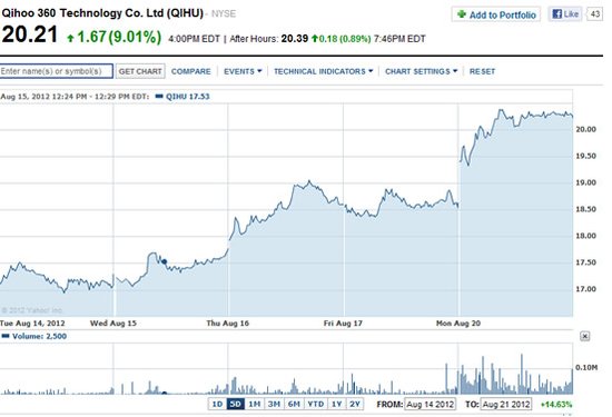 360最近股價(jià)大幅提升,截止今日360收盤價(jià)位20.21美元,上漲1.67美元,漲幅高達(dá)9.01%。自360傳出做搜索以來(lái)其股價(jià)已持續(xù)上漲。
