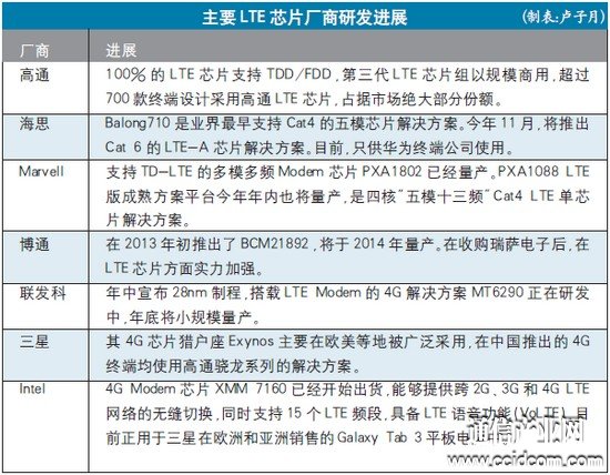 博通也于2013年發力LTE領域。在2013年初推出了BCM21892,它能夠支持FDD-LTE、TD-LTE、HSPA+、TD-SCDMA、GSM等,將于2014年量產。在收購瑞薩電子后,博通在LTE芯片方面實力加強。