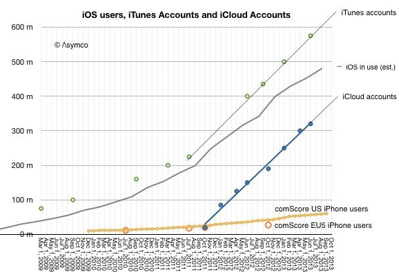 圖表中給出了擁有已激活iTunes賬號的用戶總數(shù),以及擁有iCLoud賬號的用戶總數(shù);此外,地區(qū)性的iPhone數(shù)據(jù)則對iOS設(shè)備的用戶增長提供了某種額外的測試。最終得出的結(jié)果是,iOS活躍用戶總數(shù)“大約為5億人”,每個月增加1100萬人左右。