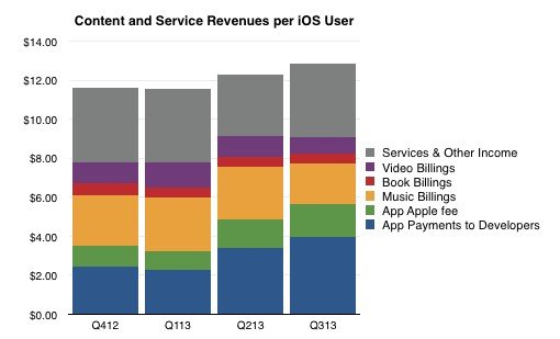 在得出iOS生態(tài)系統(tǒng)中共有大約5億名活躍用戶的推斷以后,下一步要做的事情就是對這些用戶所能創(chuàng)造的價(jià)值進(jìn)行測量。根據(jù)蘋果公布的數(shù)據(jù),iTunes服務(wù)的季度總營收為42.6億美元;再考慮到媒體零售和購買活動相關(guān)數(shù)據(jù),iOS用戶平均季度支出的圖表就呼之欲出了。詳見下圖: