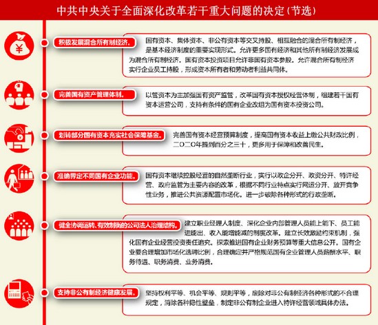 此次《決定》提出了國企改革的方向,包括積極發(fā)展混合所有制經(jīng)濟、明確國有資本繼續(xù)控股經(jīng)營的自然壟斷行業(yè)改革內(nèi)容、提高國有資本收益上繳公共財政等引發(fā)廣泛關(guān)注。