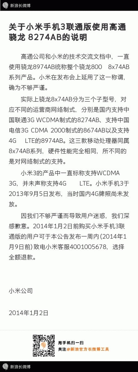 1月2日消息,針對網(wǎng)友有關(guān)小米手機(jī)3聯(lián)通版偷換CPU的質(zhì)疑,小米公司今天下午發(fā)布微博向用戶致歉,稱小米與高通一直使用驍龍8974AB統(tǒng)稱整個驍龍800 8x74AB系列產(chǎn)品,措辭上不夠嚴(yán)謹(jǐn),并接受2014年1月2日前購買小米手機(jī)3聯(lián)通版用戶的全額退款。