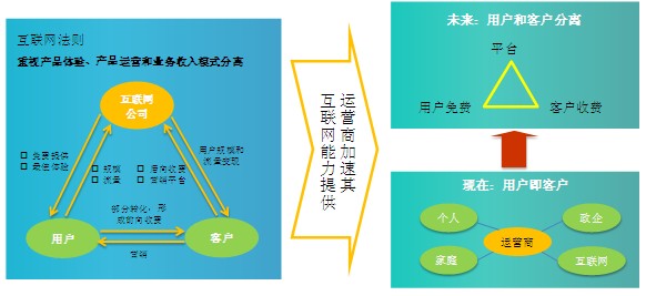成都 做網(wǎng)站 —作為產(chǎn)業(yè)鏈密不可分的上下游,電信運(yùn)營商可以向互聯(lián)網(wǎng)SP學(xué)習(xí)成功的互聯(lián)網(wǎng)經(jīng)驗(yàn)。互聯(lián)網(wǎng)服務(wù)提供商重視產(chǎn)品體驗(yàn),采用產(chǎn)品運(yùn)營和業(yè)務(wù)收入分離的模式。互聯(lián)網(wǎng)公司將營銷對象分成兩類群體:用戶和客戶。首先通過免費(fèi)提供、改善體驗(yàn)的方式獲得海量的用戶群,如騰訊QQ目前高達(dá)8.18億的月度活躍用戶數(shù);緊接著,基于龐大的免費(fèi)用戶群,吸引廣告商、增值業(yè)務(wù)提供商、APP開發(fā)者,進(jìn)行后向收費(fèi),實(shí)現(xiàn)用戶規(guī)模和流量的變現(xiàn);同時通過差異化的服務(wù)來實(shí)現(xiàn)“免費(fèi)用戶”向“付費(fèi)客戶”的轉(zhuǎn)化,進(jìn)一步增加收入,形成良性的商業(yè)運(yùn)營模式。如圖所示。
