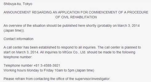 據(jù)國(guó)外媒體報(bào)道,剛剛宣布破產(chǎn)的Mt.Gox日前在其官網(wǎng)上發(fā)布了一則日語(yǔ)和英語(yǔ)的公告,并提供了一個(gè)電話號(hào)碼,接受來(lái)自所有用戶(hù)任何有關(guān)于Mt.Gox問(wèn)題的詢(xún)問(wèn)。