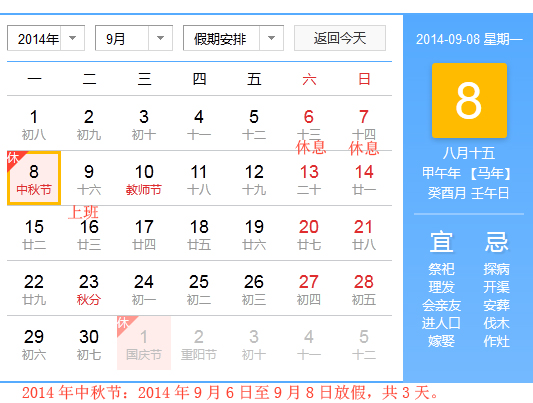 2014年中秋節(jié)在即,為了便于提前安排好工作和生活,現(xiàn)根據(jù)國(guó)務(wù)院辦公廳通知精神及公司的福利政策,將中秋節(jié)期間的放假安排通知如下: