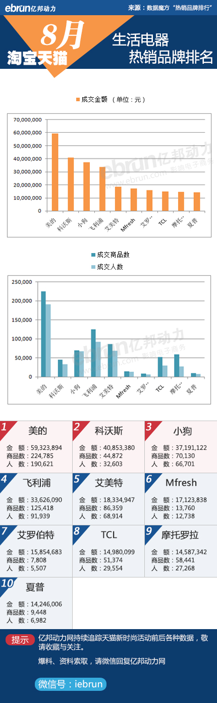 9月9日消息,億邦動力網根據數據魔方信息,匯總了8月份生活電器品類在淘寶和天貓平臺銷售排名前十品牌的銷售數據。美的在8月的銷售出現了大幅下滑,不過依舊以5932萬元的成交額排在榜首。