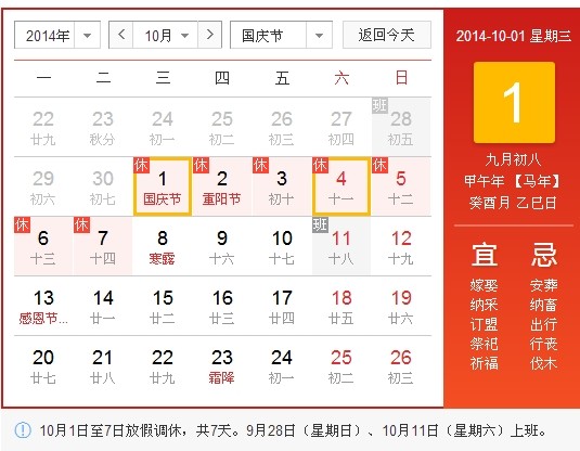 10月1日(星期三)至10月7日(星期二)放假調(diào)休,共7天。9月28日(星期日)、10月11日(星期六)上班。
