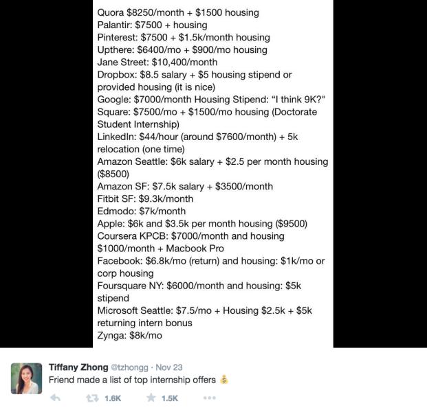 而從下圖(一個叫 Tiffany Zhong的Twitter網(wǎng)友披露出來的)可以看到現(xiàn)在更多科技巨頭給實習(xí)生開出的工資。這一數(shù)字已經(jīng)比上述2月份Glassdoor的報告有所增長(或許是將津貼包含了進去)。比如Facebook的實習(xí)薪資為6800美元,外加1000美元的住房補貼。谷歌的為7000美元基本薪資外加住房津貼,可能達(dá)9000美元。蘋果的為6000美元,外加3500美元住房津貼。Quora的為8250美元,外加1500美元住房津貼。亞馬遜西雅圖為6000美元,外加2500美元住房津貼,亞馬遜舊金山為7500美元,外加3500美元住房津貼。連Fitbit這種新創(chuàng)公司也到了9300美元。