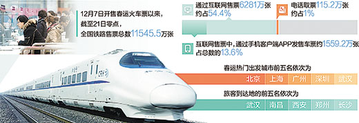此外,12月12日上線的手機(jī)客戶端2.0版改善了用戶購(gòu)票體驗(yàn),簡(jiǎn)化了購(gòu)票操作,同時(shí)優(yōu)化了網(wǎng)站購(gòu)票流程。據(jù)介紹,春運(yùn)火車票開(kāi)售以來(lái),手機(jī)客戶端發(fā)售車票占比13.6%,12306網(wǎng)站占比40.9%。