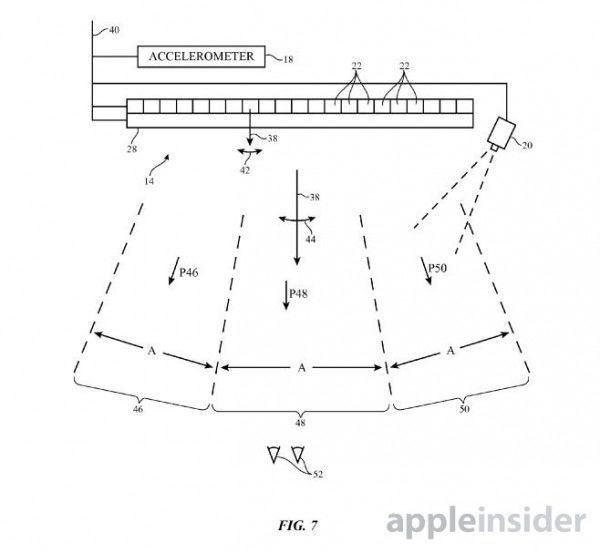 根據(jù)蘋果的專利申請(qǐng)文件,這項(xiàng)專利描述了一種帶有次級(jí)子像素陣列和透鏡結(jié)構(gòu)的顯像元素陣列,其中的透鏡結(jié)構(gòu)可以將光線折射到各種不同的角度,最后通過關(guān)鍵組件"光線導(dǎo)向器"的處理,最終將構(gòu)成3D影像的立體光柱導(dǎo)向觀察者。此外,相關(guān)設(shè)備還可以利用攝像頭、加速器、陀螺儀和GPS來控制該把光導(dǎo)向什么方向。