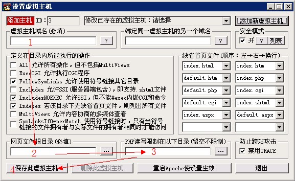 保存好虛擬主機后,要點擊“重啟Apache使設(shè)置生效”,新的站點才會生效。
